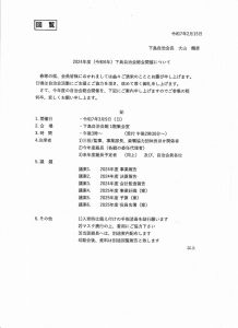 下島自治会館1階集会室・午後3時~ (受付午後2時30分~) 1)三役/監事、事業部長、委嘱協力団体長ほか関係者 2)今年度組長(各組の委任代理者) 3)来年度組長予定者 (同上) 及び、自治会員各位