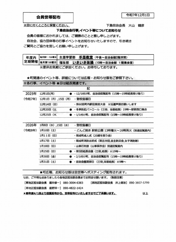• 下島自治会行事、イベント等についてお知らせ令和7年12月